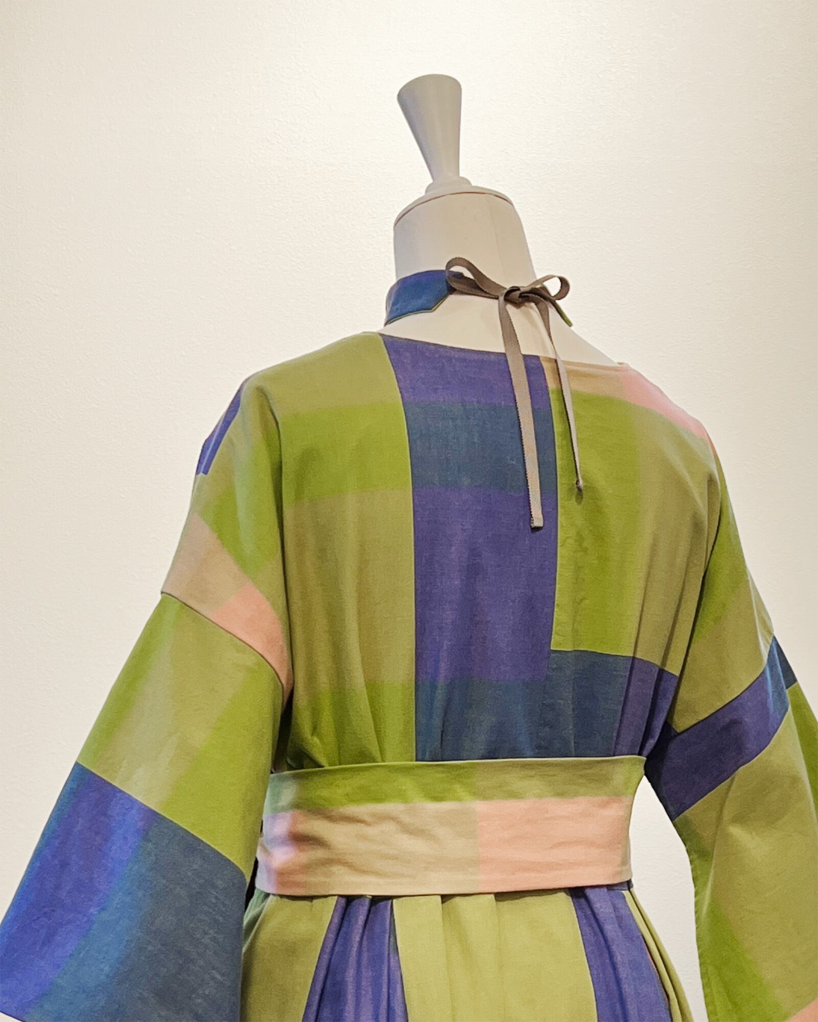 シンプルで普遍的なデザインのカシュクールワンピースが、反物の美を見事に映し出し、躍動します。